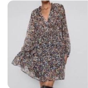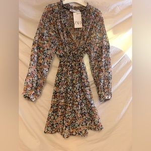 ✨NWT Zara Multicolor Floral Long Sleeve Tie Waist Button Front Ruffle Mini Dress