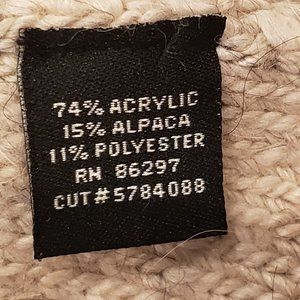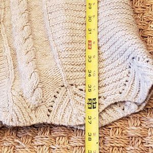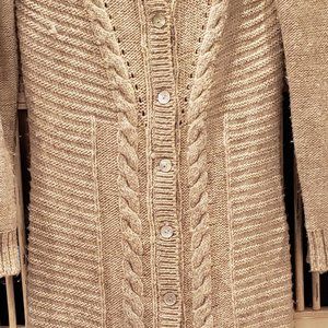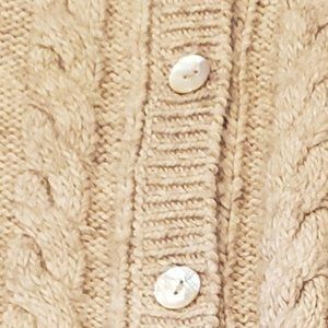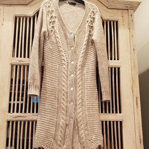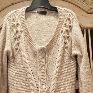 This is a long sleeve button down cable knit sweater by BCBG Max Azria. Great to wear with pants or dresses. Very neutral oatmeal color.