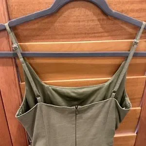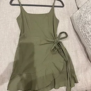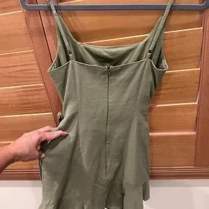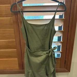 Square neckline. Adiustable shoulder straps, Wrap style skirt, Tie fastening at side, Invisible zip fastening at back, Ruffle hemline. Light green is the actual dress. Other colors are not for sale, just shown as example.