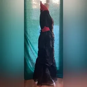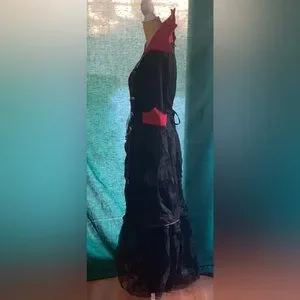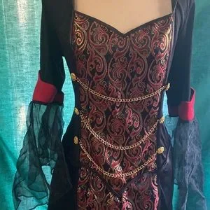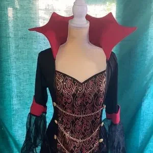 Sexy Women's Costume Vampiress Long Black & Red 🖤❤️ with Gold Accent Chains & Buttons Gothic Designs on Bodice of Dress