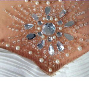 Bodycon style with a dark tan colored mesh bodice, heavy jeweled with pearls etc. I am trying to get some photos, but the bride has moved overseas, if you need any more measurements, please write.