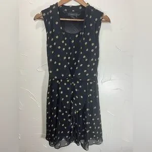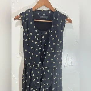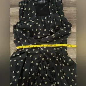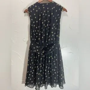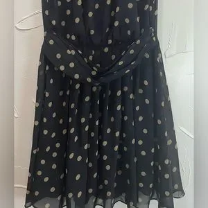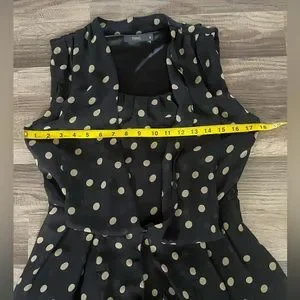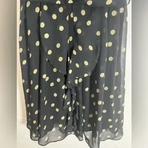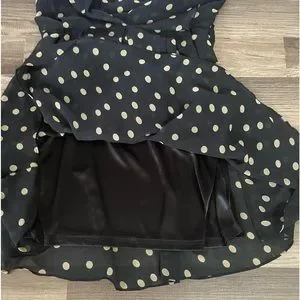 This cute polka dot dress hits above the knee to add to the fun of this flirty dress. Light, airy and flows in the right places. Fully lined under the sheer outer material. Super versatile and can be worn for almost any occasion or any place!