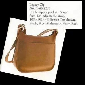 Classic and beautiful navy glove-tanned leather shoulder bag with brass hardware. Convenient exterior front slip pocket. Top zipper keeps contents secure. Inside zippered pocket and also a slip pocket. 42” adjustable strap with brass buckles. Brass feet protect the bottom of the bag from scuffs. Original hangtag. Bag charm included.