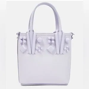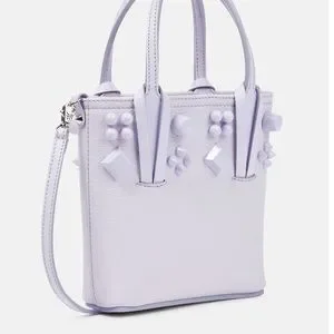 Christian Louboutin's Cabata N/S Mini tote is made from supple pastel purple calf leather, studded with signature spikes and geometric appliqués. Lipstick-red accents, including the base, remind us of the brand's unmistakable shoe soles.