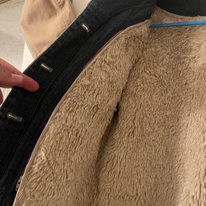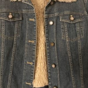 Comfy INC Jean jacket with zippered removable lining, size medium, two of the pearly part of the button came off, one at bottom and one close to top but as seen in photos you could remove from sleeves which aren’t seen anyway and move to the front. This jacket was hardly worn, it is like new aside of the button faces coming off.
