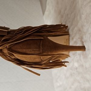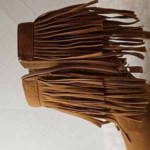 Brown 4" heels round front bootie boots with fringe, inner zipper, and gold buckle on outer boot.