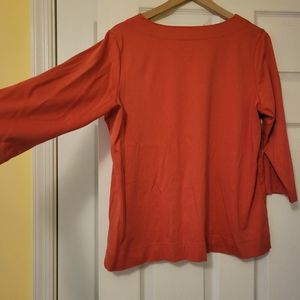 LL Bean Pink V Neck Tee NWOT, Size XL Reg, it looks more orange in the pictures but it is pink! 100% supima cotton. So pretty! Soft! From a clean pet and smoke free home! 3/4 sleeves. Very classy and flattering shirt !