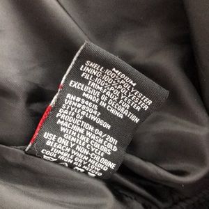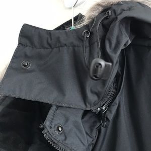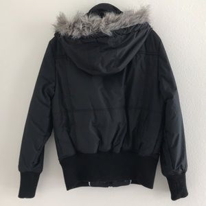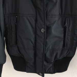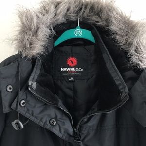 Hawke & Co. Jacket. Bomber style. Black polyester. Removable zip-on/off fur trimmed hood. Zipper and front. Elastic waistband and cuffs. Zipper hip pockets. Zipper pocket on left arm. Water resistant. Polyester filled. Warm and ready for winter weather!