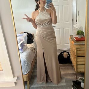 Gold champagne velvet high neck open back dress from Revelry! Style is “Fallon”, purchased regular length and hemmed to fit someone 5”5 in 3inch heels ✨