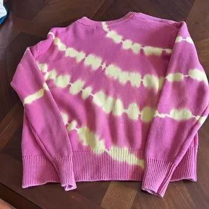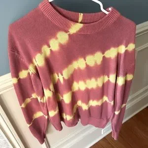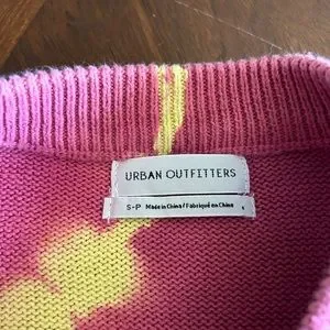 Urban outfitters sweater size small. The pattern is a bit of a tie-dye. The color is yellow with a raspberry type pinkish color. It was worn a few times, so there is some wear as it has faded a bit. No holes or tears or stains. It is 100% cotton and has a ribbed collar, cuffs, and waistband. Smoke free home.