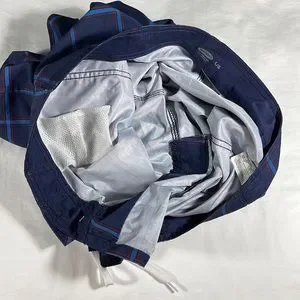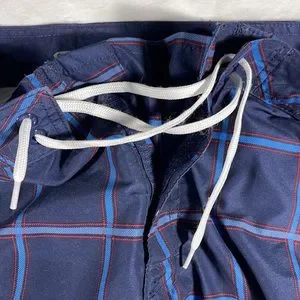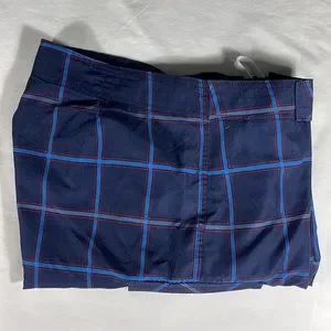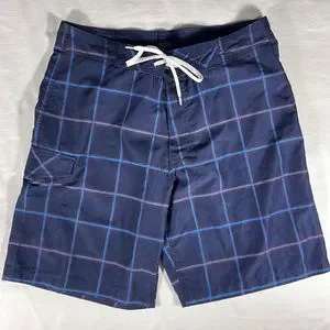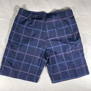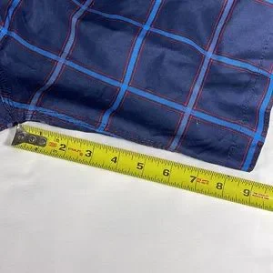 Great condition, rarely worn, 100% polyester navy with light blue and red large checkered pattern board shorts, Velcro fly with string closure, single Velcro pocket on right leg, 9” inseam
