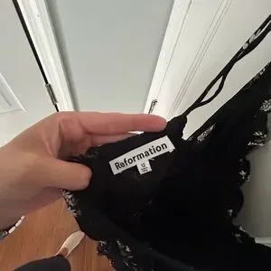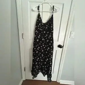 Reformation Embry dress in color Daisy size 12. Black non-stretch crepe with white daisy pattern. Ruched bust, form fitting bodice and flowy skirt. Midi length. Adjustable tie straps. Worn once, excellent condition