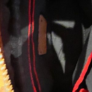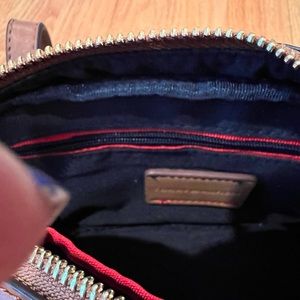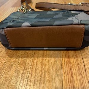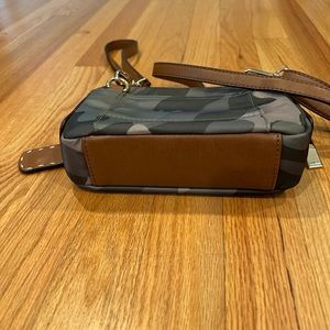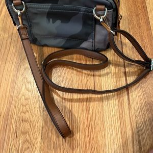 8” x 5 1/2” x 2” perfect condition on inside and out. Unique Camo print. Zip top with two wall pockets one zips. Stap is approximately 25”long and adjustable. The belt slot is 2” wide! Great for a day trip ball park concert etc.