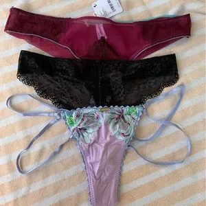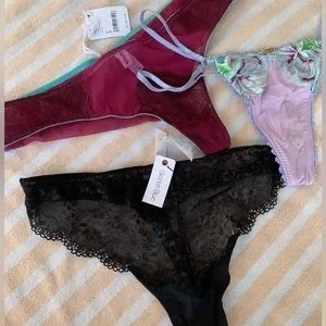 Skarlette Blue Rouse Thong, Nette Rose Mae string thong, and Dora Larsen Orla lace undies thong, the tag is missing from the Nette Rose pair, but they are new