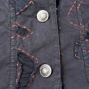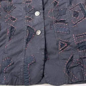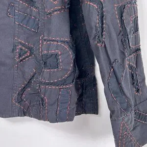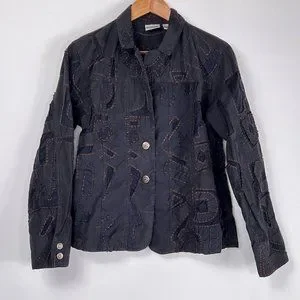 Chicos Black Abstract Art to Wear Contrast Stitch Distressed Fringe Button Blazer Jacket M 1 FLAW READ