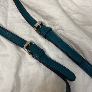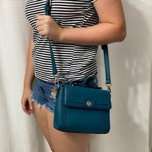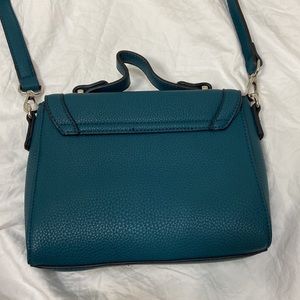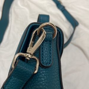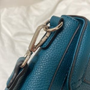 Like new. The purse/crossbody bag is a deep blue/teal color. The strap can be removed by the clips found on each side. The bag has a handle which can be used if the strap is removed. The strap has two buckles to lengthen and shorten. The strap has 5 holes to adjust the length on each side. All the buckles, snaps, and zippers are silver in color. The front flap is fastened by a magnetic snap. Once the magnetic clip is opened, there is a zipper used as an extra closure. There are two smaller pockets inside the purse, one with a zipper and one without. Made in China.