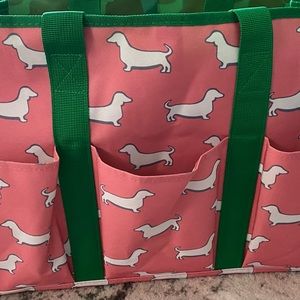 Super cute beach/swim dachshund pink & green bag with two green shoulder straps and six outside open pockets. It’s large & sturdy!