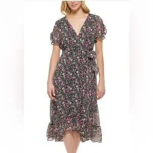 Karl Lagerfeld Paris Floral Short Sleeve Chiffon Faux Wrap Dress