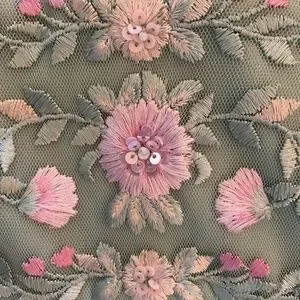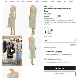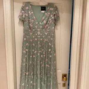 Mac Duggal Green and Pink Embroidered Flutter Sleeve Midi dress. I am posting for my mom, she bought this new and wore this once to my brothers wedding and promptly dry cleaned it after. It is in pristine condition.