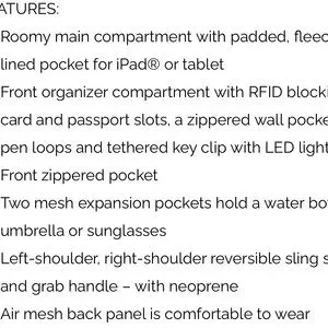 • Main compartment has organizer panel, slip pockets and zippered pocket