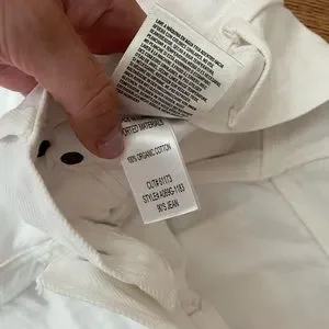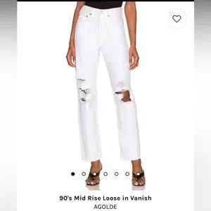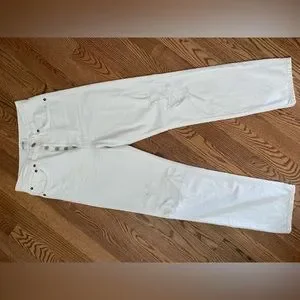 Agolde mid rise 90s (which are actually still a 12” rise) in colour Vanish (actual white). Purchased from Revolve last year. Please note that there is a stain on the front pocket, my tide to go stick reacted with too much direct sunlight and turned a little patch pale yellow. Should be fixed with bleach, price reflects this flaw. Open to offers!