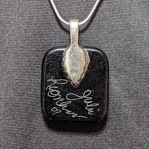My Late Wife of 17 Years was a renowned Silversmith and Glass Artisan, who made Wire-Wrapped Pendants, Solid Sterling Silver Bracelets and much more. This is one of the pieces that was sold at Art Shows throughout the Midwest...and now due to her passing, I am offering this for sale. Pendant is in New Without Tag (NWOT) Condition, with minor facetious wear from sitting. My wife signed this with her name on the back and " '07 ".