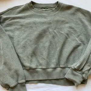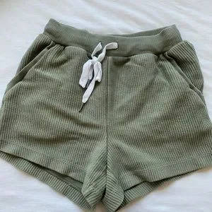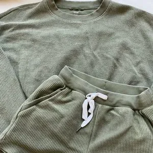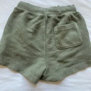 This comfy sweat set has barely been worn! It has the cutest textured pattern and color. The sweater fits a little oversized but is a size small, and the shorts are size xs with drawstring
