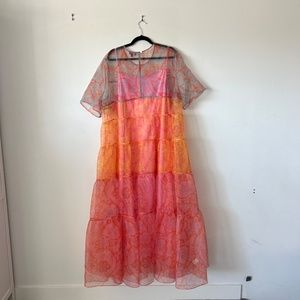 The Hyacinth Dress in sheer organza is a tiered maxi with a single back button closure. This style includes a removable inner slip.