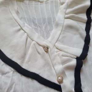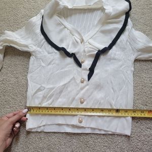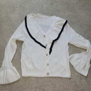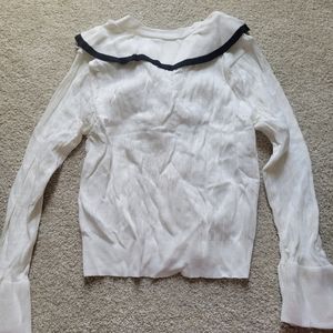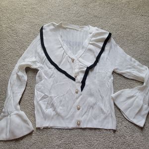 thin pullover. looks like a cardigan. can dress up or wear for work. no brand or size tag. measurements in photo..fits like a small