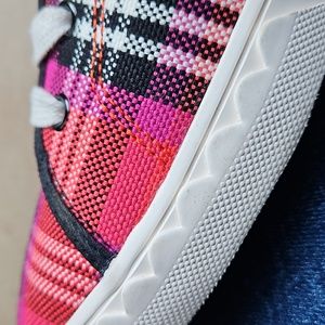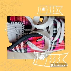 NWOT Kate Spade Tennis Shoe in size 9. They are a pretty plaid canvas shoe of black, white, pinks and a dab of purple. Look at the scalloped edge. So doggone cute!