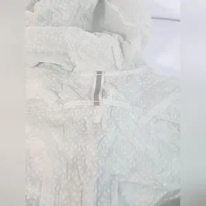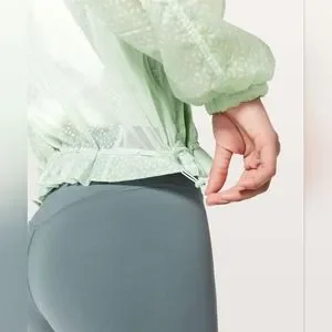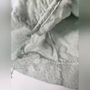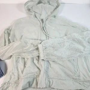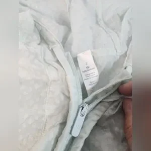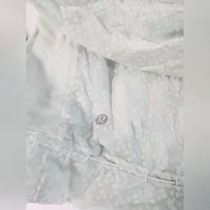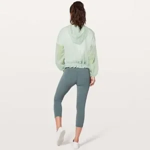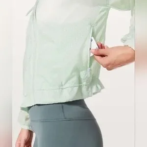 Lululemon Find your Flock zip hooded jacket in rococo sea breeze julep which is like a very faint sage green color. Water and wind resistant yet it has a cool transparent pattern design. Cropped style with adjustable drawcord, reflective locker loop, pockets, and lightweight material. This is like new but does have a super faint spot that should come out in the wash. Womens size 2.