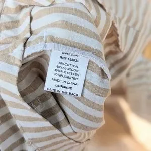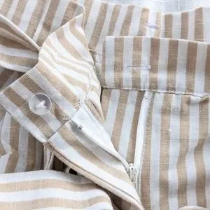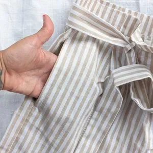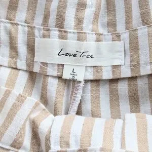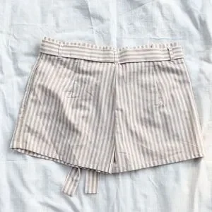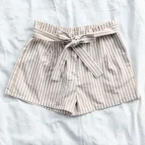 Lightweight cotton taupe striped paper band shorts from Love Tree! Button/ zip closure with tie belt at waist. Two side slit pockets. Like new condition, size L measures 16" across waist, 21.5" across hips and has a 2.5" inseam.