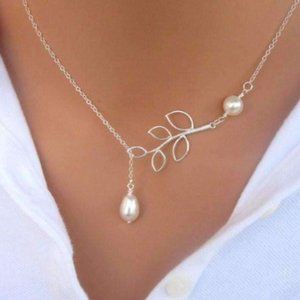 Pearl Droplet Thread Necklace 14K White or Yellow Gold plated for Woman White Pearl