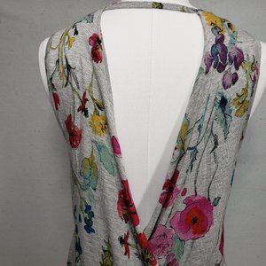 Cute Rachel Roy gray dress of super-soft 100% viscose knit fabric. Pink, yellow, turquoise & green floral design on gray heather background. Crossover open back for ventilation makes it perfect for summer or warm climates. Size L. Excellent pre-loved condition, no signs of wear.