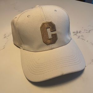 C Embroidered Summer Baseball Cap for Women. New, adjustable baseball cap with varsity C letter embroidery. Beautiful sturdy and great quality hat in a cream with champagne taupe lettering. Adjustable sizing. Poly/Cotton blend.