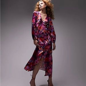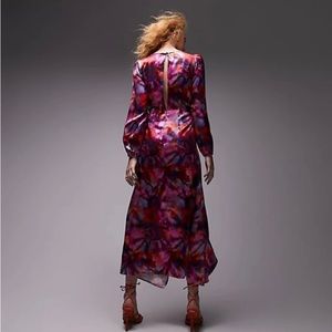 ASOS Topshop v-neck rose print dress in bright pink. Midi length