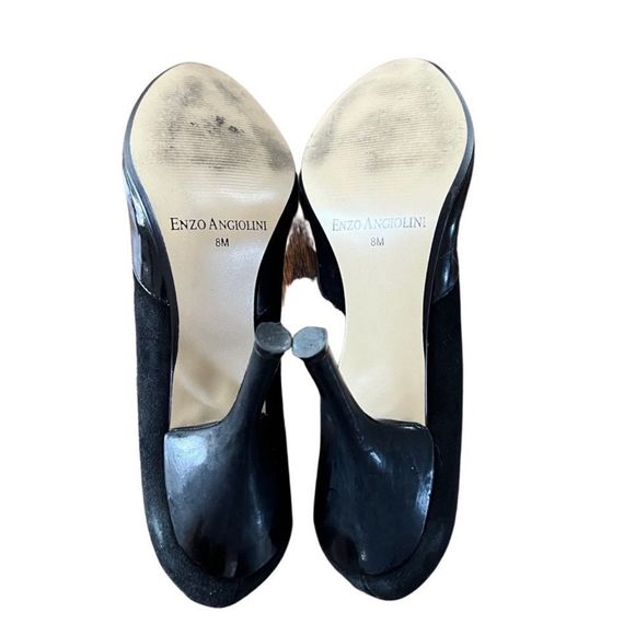 Good🎉 Condition ENZO ANGIOLINI open toed black heels, size 8. Mix of different textures- black suede and shiny leathery material. Slim heel. Approx 4 in heel. Pairs well w both dresses and pants! ❤️