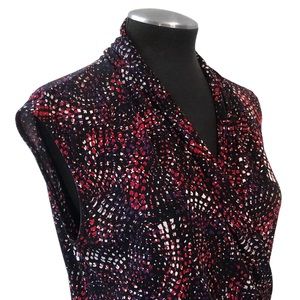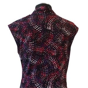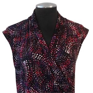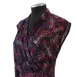 Knit stretchy fabric with a black, purple and red print throughout. Pullover surplice style top with a drape neckline and faux wrap structure. Medium weight and unlined with a regular fit. Allows for plenty of stretch. Top is in excellent, like new condition with no flaws. Feel free to ask questions. Save more with bundles!