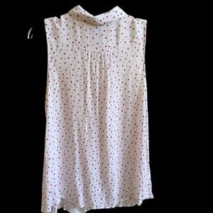 Nice rayon gauze sleeveless button front blouse is white with a red and pink teardrop print. It has lace trim at the bodice and a removable neck tie bow. Size M measures 26” from shoulder to hem and 19” across the chest. Very good preowned condition.