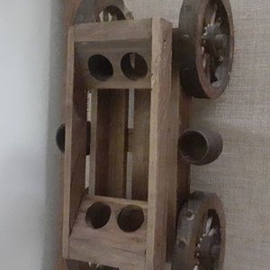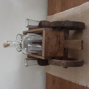 Wooden wagon was handcrafted in Mexico and includes a glass decanter abd 6 shot glasses.