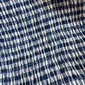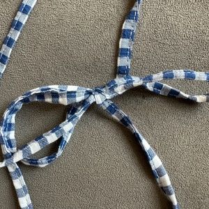 Self tie spaghetti strap gingham plaid smocked mini dress with front cutout self tie detailing.