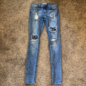 Blue spice distressed patched jeggings. Minor signs of wear in good condition. Size 3.