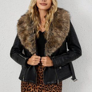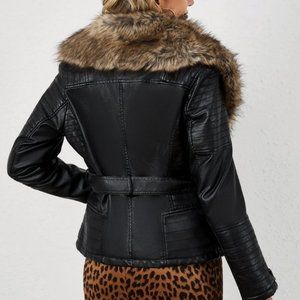 Brown Faux Fur Black Leather Belted Motorcycle Bomber Jacket Sherpa Winter Coat