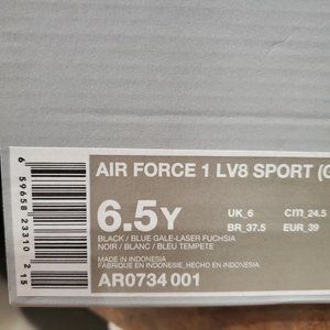 New In Box, No Box Top, 100% Authentic, Firm Price! The legend lives on in the Nike Air Force 1 LV8 Sport, a modern take on the hoops icon that blends classic style and fresh, crisp details. Color: Black/ Blue Gale/ Laser Fuchsia. Youth Size 6.5Y = Women's Size 8 (24.5cm)