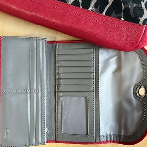 Wallet is 4-1/2” x 7-1/2” with lots of card slots & with 4 long slots & a zippered section for coins