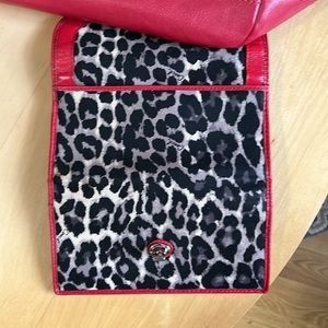 Ocelot print fabric with red leather trim