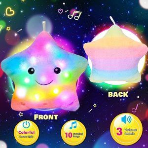 * LED & MUSICAL STAR PILLOW: This is a good plush pillow to show your kids that what is a star and how to shine. On the top of our pillow is a hanging rope for you to hang up this pillow easily. It is in the shape of twinkle star, looking cute and adorable. It’s a very cute pillow, which can bring you a good mood.