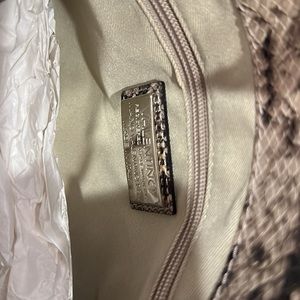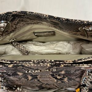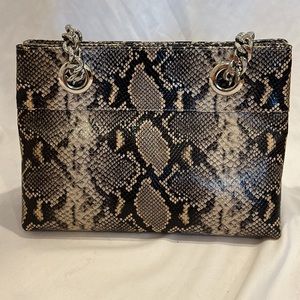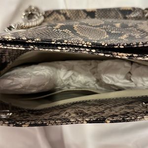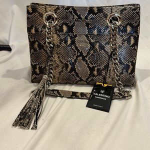 NWT Mario Valentino snake print with silver leather should bag. Made in Italy. Two large compartments with magnetic closure. Front large compartment has a side pocket. Silver chain shoulder straps with snake print material. Back large compartment has zippered pocket. And a fun bag charm.