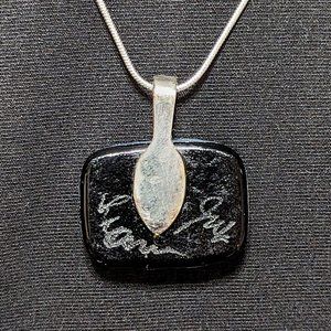 Shimmery RULA GLASS Signed Dichroic Glass Pendant, with a stunning Silver Dichroic Glass, Black Glass Stringer and a Solid Black base Glass. This pendant embodies understated elegance, perfect for evening occasions!