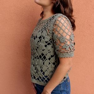 SOLD Vintage Y2K 2000s Chico's Crochet Olive Green Blouse / Pullover Quilt Style